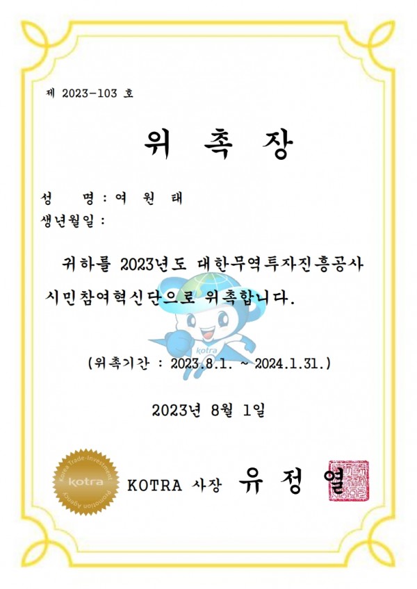 Letter of Appointment of KOTRA Citizen Participation Innovation Group 관련링크 mondereve 612 0 본문 Letter of Appointment of KOTRA Citizen Participation Innovation Group SHARE THIS PAGE 목록